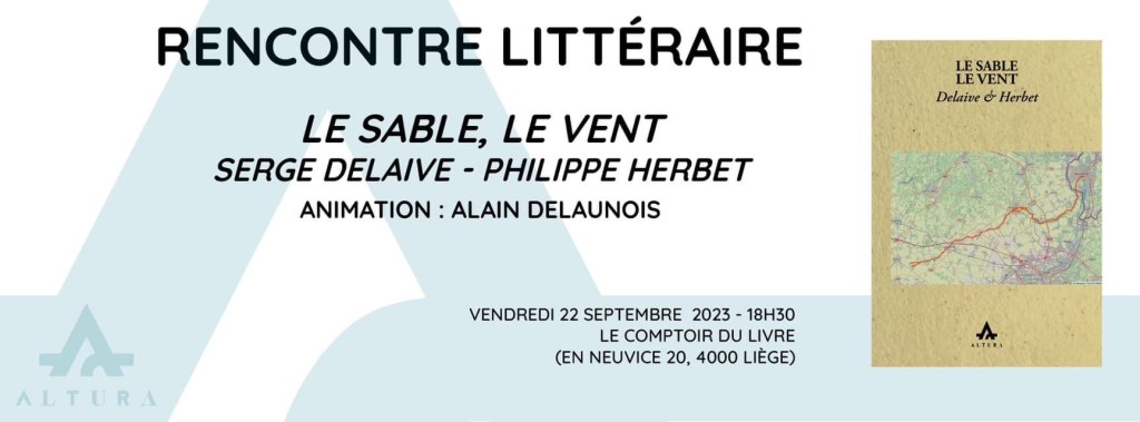 La librairie Pax a le plaisir de vous inviter à une rencontre croisée entre Serge Delaive etPhilippe Herbet à l’occasion de la sortie de leur dernier livre, Le sable le vent, paru aux éditions Altura.