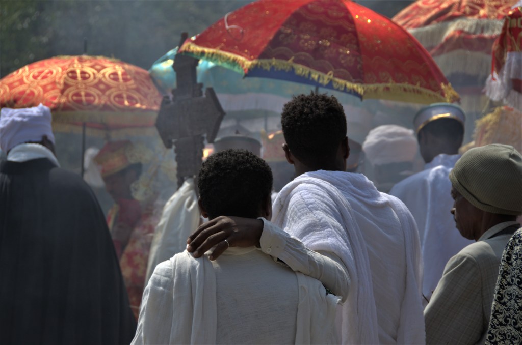“Pour moi, cette photo illustre bien le thème de la “fraternité” ou d’amitié (si on veut). Il s’agit d’une photo prise en Ethiopie lors d’une procession religieuse pendant la fête du Timkat qui correspond à l’Epiphanie chez nous.”